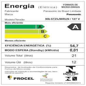 Diferenciais: - Capacidade: 21L, - 700W de potência, - Com Desodorizador, Memória e Trava de Segurança. Características: Capacidade Bruta (L) 21 Capacidade Líquida (L) 12 Potência Micro-ondas 700W Níveis de Potência Micro-ondas 10 Procel A Eficiência Energética 54,7% Consumo de energia 1250W Receitas Pipoca, Leite, Arroz,Brigadeiro e Lasanha Auto descongelamento Carnes, Feijão e Sorvete Carnes, Feijão e Sorvete Desodorizador Sim Memória 3 Auto Reaquecimento Sim Timer Sim Relógio Sim Trava de segurança Sim Diâmetro do Prato (cm) 27 Tipo de painel Digital Porta Branca Cor externa Branca Cor da cavidade Branca Cor do Display Branco Material Gabinete Cavidade: Aço Eletrozincado, PortaVidro, Puxador e Painel: Plástico Frequência 60Hz Largura do Produto (cm) 46,1 Altura do Produto (cm) 28,7 Profundidade do Produto (cm) 37,3 Peso do Produto (kg) 11 Largura da Embalagem (cm) 49,9 Altura da Embalagem (cm) 33,7 Profundidade da Embalagem (cm) 38,4 Peso da Embalagem (kg) 11,6 Empilhamento 7 (1+6) Garantia 12 meses