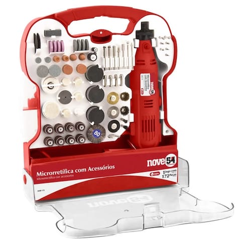 • 1 Microrretífica, composta por um estojo plástico com 172 acessórios, sendo: 1 bastão abrasivo, 1 chave para microrretífica, 4 cilindros de feltro, 74 discos de corte, 10 discos de lixa, 1 escova circular inox com haste, 1 escova circular latão com haste, 1 escova circular nylon com haste, 2 escovas pincéis inox com haste, 1 escova pincel latão com haste, 1 escova pincel nylon com haste, 2 hastes para disco de corte, 1 haste para disco de feltro, 2 hastes para lixa cilindro, 1 haste para roda de pano, 7 limas rotativas, 3 limas rotativas diamantadas, 30 lixas cilindro, 1 pasta para polimento, 4 pinças para microrretífica, 1 ponta com feltro, 10 pontas montadas, 4 rebolos de carbureto de silício, 4 rebolos de óxido de alumínio, 1 roda de borracha, 1 roda de feltro, 1 roda de lixa e 1 roda de pano