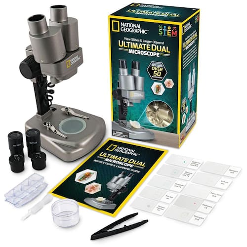 DOIS MICROSCÓPIOS EM UM Use as luzes LED inferiores para visualizar espécimes biológicos em slides ou mude para as luzes superiores para examinar objetos 3D em detalhes intrincados. A atividade STEM perfeita para meninos e meninas. MAIS DE 50 ACESSÓRIOS INCLUÍDOS Explore um conjunto selecionado de 10 slides preparados com uma variedade de espécimes biológicos e, em seguida, crie o seu próprio com os slides e capas em branco incluídos, pinças e um conta gotas. Este kit completo também inclui uma placa de Petri para laboratórios de plantas, um mini geodo e muito mais PODEROSA FERRAMENTA DE APRENDIZADO Este microscópio possui dois conjuntos de lentes de vidro óptico que fornecem ampliação de 20x e 50x e é fácil de operar, tornando o aprendizado divertido e acessível para jovens cientistas. Experimentos científicos infantis nunca foram tão divertidos EXPERIMENTO DE CAMARÃO DE MASSA INCLUÍDO Acompanhe o ciclo de vida do camarão de salmoura com o experimento completo incluído Inclui estação de incubação, ovos de camarão, placa de Petri e manual de laboratório. Inclui um guia de aprendizado STEM detalhado e colorido. BRINQUEDOS EDUCACIONAIS DE ALTA QUALIDADE A National Geographic tem o orgulho de fabricar brinquedos científicos práticos da mais alta qualidade, e todos os nossos produtos são apoiados por um serviço excepcional Marca: Não Informado