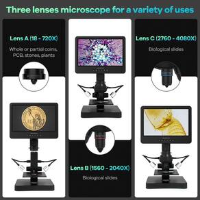 -?Microscópio digital multi-lente para adultos, crianças e estudantes?A lente A (18-720x) pode ser para observar moedas ou peças inteiras, placas de circuito, plantas, pedras, etc. A lente B (1560-2040x), a lente C (2760-4080x) podem ser s para observar lâminas biológicas.