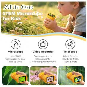 O equipamento possui formato compacto e leve, adequado para crianças, com pegada ergonômica para uso com uma das mãos e alça de pescoço para transporte. A função 3 em 1 permite uso como microscópio para observação aproximada, como espécie de telescópio digital para objetos mais distantes, além de gravação de fotos e vídeos quando utilizado com cartão TF.?
