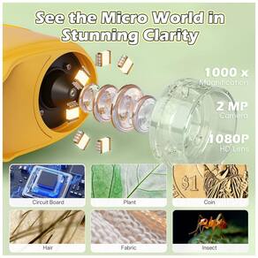Microscópio digital infantil portátil com aumento de até 1000x e tela integrada em alta definição 1080P, projetado para visualização de detalhes de objetos do dia a dia, como insetos, folhas, tecidos, pele e moedas. A iluminação é feita por LEDs integrados, oferecendo cores nítidas e boa definição de imagem para exploração visual em diferentes ambientes.?