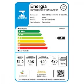Caracteristicas: Com amplo espaço e design moderno, a Duplex 425L Midea é ideal para você e sua família! No segmento de refrigeradores duplex frost free de plataformas de 60cm e até 430 litros, de acordo com os refrigeradores disponíveis na tabela do INMETRO acessada em 05/06/2024. Cor: Inox Material de fabricação: VCM -Vinyl Coated Metal-: é um acabamento decorativo laminado sobre um substrato de aço zincado. Não é aço inox PCM -Pre Coated Metal-: substrato de aço zincado com pintura decorativa aplicada na superfície superior. Capacidade: Freezer -L- ? 120L. Refrigerador -L- ? 305L. Frequência: Tipo: Geladeira. Painel: Sim, touch. Voltagem: 127V / 220V Funções do Produto: Espaçosa: 425L no total, com 120L de freezer, o maior do segmento!* Armazene seus alimentos e bebidas com mais facilidade e organização. No segmento de refrigeradores duplex frost free de plataformas de 60cm e até 430 litros, de acordo com os refrigeradores disponíveis na tabela do INMETRO acessada em 05/06/2024. Compartimento extra frio: Ideal para frios e bebidas mais geladas. Turbo freezer: Temperaturas mais baixas em menos tempo. Prateleiras de vidro Práticas, facilitam a limpeza e na organização dos alimentos, além de maior estabilidade para latas e garrafas. Econômica: Menor consumo, e classificação A+ de eficiência energética