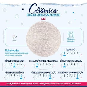 recomendada para filtros ultra finos. A cerâmica tipo matrix l33 mega aquários é uma mídia filtrante porosa e permeável de alto desempenho, fabricada a partir de materiais sintéticos e naturais como vidro e barro e sintetizados em alta temperatura que passam de 1200 graus, proporcionando um ótimo instrumento para a colonização de bactérias benéficas ao aquário ou lago. Essas bactérias realizam a nitrificação aeróbica e nitrificação anaeróbica ao mesmo tempo, tornando a qualidade da água mais saudável. Características: mídia para filtragem biológica remove amônia, nitrito e nitratos remove impurezas solúveis e insolúveis reduz algas equilibra a biologia da água fácil manutenção fortalece a imunidade dos animais aquáticos não altera o ph auxilia na filtragem mecânica auxilia na clarificação da água polímero microporoso cada micro tem contato com o fluxo dágua em todo seu entorno, aumentando significativamente sua área de colonização pode ser utilizado em aquário de água doce ou marinho necessita bolsa para mídia filtrante não acompanha bolsa para mídia filtrante - adicione em seu carrinho: bolsa para mídias filtrantes modelo tnt 9x11cm. Especificações técnicas: marca: mega aquários modelo: l33 validade: indeterminada composição: vidro sintetizado e cerâmica de alta porosidade conteúdo da embalagem: 500g cada 500g trata aproximadamente até 1000 litros de água tamanho aproximado: as cerâmicas podem variar de 1 a 2mm nível de porosidade 1 a 5 : 3 nível de resistência 1 a 5 : 5 facilidade de fluxo de água entre as peças 1 a 5 : 1 nível de área de colonização 1 a 5 : 5 nível de poeira gerado no atrito entre as cerâmicas 1 a 5 : 1 eficiência na cultura de colonização de bactérias 1 a 5 : 5 67,000 bactérias por centímetro cúbico 500g de cerâmica l33 mede aproximadamente 13 x 13 x 1cm larg x alt x profundidade . Ideal para: filtro hang-on médio e grande, filtro interno médio e grande, calhas de filtragem de aquários com tampa pequenos, médios e grandes, canisters, filtro pressurizado, sumps, sistemas dry-wet, sistemas de filtragem de lago, fontes e espelhos dágua. Modo de uso: 1 antes do uso, enxaguar preferencialmente com água deionizada ou sem cloro 2 coloque a cerâmica em bolsas para mídia filtrante de acordo com o espaço do filtro 3 insira a cerâmica em seu filtro, coloque em uma área com fluxo moderado de água 4 após 20 dias de ciclagem em seu sistema de filtragem o produto estará pronto para realizar a filtragem biológica 5 caso necessário, utilize um acelerador biológico para obter colônias de bactérias mais rápido. Dicas: reponha a cerâmica sempre que necessário, visto que a cerâmica desgasta conforme o fluxo de água. Nunca substitua a cerâmica de uma vez para não perder a colonização de bactérias. Bolsa para mídia filtrante: indicado utilizar bolsa para mídia filtrante de tnt ou de malha fina pesquise e adicione junto ao carrinho bolsa mídia filtrante tnt 9x11cm. Manutenção: as cerâmicas mega aquários devem ser limpas a cada 30 dias, é recomendado lavar com água do próprio aquário para evitar a perda total das colônias de bactérias já estabelecidas. Se preferir, após a limpeza utilize um acelerador biológico. Obrigado pela visita e boas compras