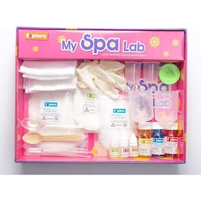 Você está pronto para um spa em casa? Explore traz-lhe o My Spa Lab! Neste divertido brinquedo educativo, você aprende a fazer suas próprias máscaras de cabelo, máscaras faciais, esfoliantes corporais, esfoliantes labiais, bombas de banho e até óleos de massagem! Número de produtos finais que você pode fazer seguir produtos: 5 bombas de banho 1 sal de banho 5 máscaras faciais / corporais Faça suas próprias máscaras faciais, máscara de cabelo, esfoliação corporal e bombas de banho em casa!