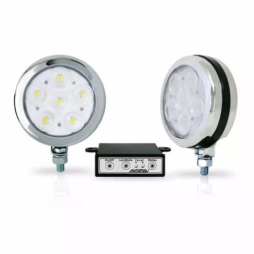 Farol redondo 6w cromado kit descrição o farol redondo 6w possui 6 led's de longa vida últil e alta luminosidade. amplia o foco luminoso de seu veículo, garantindo melhor sinalização e segurança. PART NUMBER AP808 cor do corpo: cromado com preto cor da luz: azul cor da lente: transparente informações técnicas: o kit farol redondo 6w possui 2 faróis + módulo de controle. o módulo de controle para faróis autopoli possui 9 efeitos de luz: 3 efeitos estrobo; 4 efeitos safety car; luz contínua; efeito randômico com todos os efeitos. potência: 12w par ; equivalência aproximada: farol 50w; fluxo luminoso: 1.800 lm lúmens ; índice de proteção: ip65; corpo em abs e lente em policarbonato; ângulo de abertura: 15º; 120 lúmens por watts; máximo de 5 faróis por canal; bivolt: 12 / 24v. tamanho: 8,0 cm. produto fixado por parafusos compatível com: universal conteúdo da embalagem: 02 faróis strobo redondo azul ap808 01 módulo de controle atenção: temos outras cores disponíveis, caso desejar, solicitar no ato da compra. Ean: 7898156378080