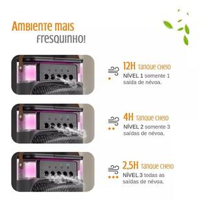 Tipo de luz: 7 luzes led Funções: ventilador / umidificador / aromatizador Tempo de pulverização: 2,5h - 12h modo umidificador Temporizador: pode desligar em 1h, 2h ou 3h