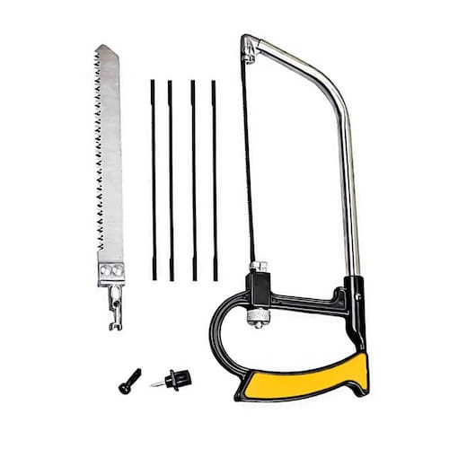 Tipo: Mini Arco de Serra Multifuncional Lâminas: 5 serras finas de aproximadamente 15 cm e 1 serra grossa de aproximadamente 20 cm Material Compatível: Alumínio, madeira, tubos PVC, borracha Acessórios: Drill e parafuso para montagem Aplicação: Pequenos trabalhos domésticos e cortes diversos