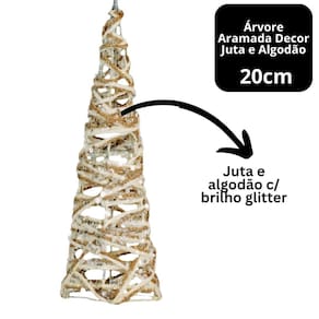 Adicione um toque rústico e elegante à sua decoração com esta mini árvore aramada decorativa, perfeita para criar composições natalinas aconchegantes e sofisticadas. Produzida com estrutura metálica e acabamento em juta e algodão nas cores palha e branco, essa árvore traz um brilho suave graças à aplicação de glitter delicado, ideal para ambientes com estilo natural ou escandinavo.