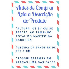 Mini bandeira japão com ventosa poliéster 5,5cm x 8,5cm Atenção nas medidas do produto Medida de 14 cm se refere ao tamanho do mastro da bandeira Medida da bandeira 8 x 5,5 cm Descrição do produto Desenvolvida para ser fixada no vidro com estilo Bandeira produzida em tecido poliéster Pedestal em pvc medindo 14 cm Bandeira de 8 cm x 5,5 cm Cordão amarelo com amarra especial Corte à laser nas bordas Estampa somente em uma face da bandeira Fabricada em poliéster leve e resistente Facilmente fixada no vidro do seu automóvel O valor se refere à apenas uma bandeira Marca: Sp Bandeiras