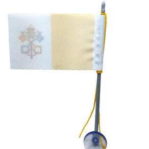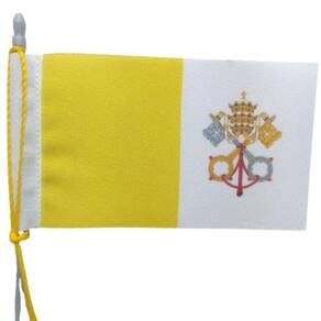 Mini bandeira vaticano com ventosa poliéster 5,5cm x 8,5cm 15 cm mastro Atenção nas medidas do produto Medida de 14 cm se refere ao tamanho do mastro da bandeira Medida da bandeira 8 x 5,5 cm Estampa somente em um lado do tecido