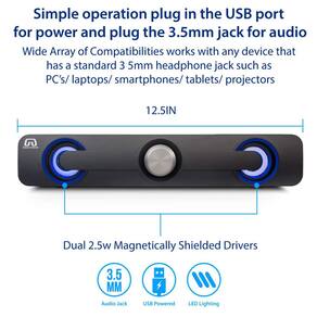 - O alto-falante da barra de som é alimentado por USB (5V), com plug, plug and play de 3,5 mm, sem necessidade de software extra. Basta conectá-lo à alimentação de 5 V e ao plugue de 3,5 mm aos seus dispositivos, acender a luz LED, aumentar o volume e se divertir.