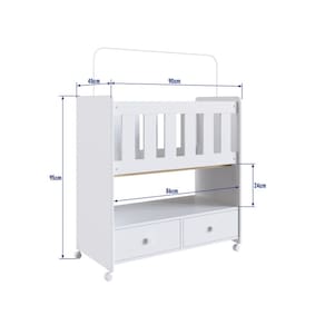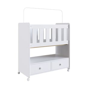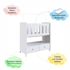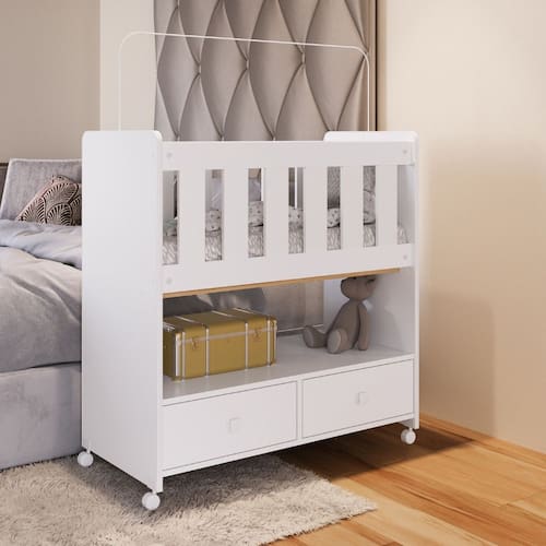 Mini Berco 2 Gavetas com Colchao Moises Completa Moveis, e compacto, ideal para ficar ao lado da cama dos pais e facilitar o cuidado com o bebe. Acompanha colchao, oferece funcionalidade na organizacao com suas gavetas e tem certificado aprovado por laboratorio credenciado pelo INMETRO.
