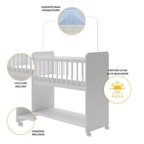 Mini Berço Compacto Portátil Para Bebê Com Rodízio Colchão Suporte Para Mosquiteiro E Prateleira Branco Uma suíte de conforto e segurança para o seu pequeno tesouro! Esse Mini Berço é uma escolha consciente, confeccionado em MDP, garantindo tranquilidade aos pais. Sua estrutura robusta, aliada à pintura UV de alto brilho, oferece durabilidade e um ambiente seguro para o bebê. Equipado com suporte para mosquiteiro e quatro rodízios permite fácil deslocamento, adaptando-se a qualquer ambiente da casa. O colchão, já está incluso no pacote, proporcionando uma experiência completa. Recomendado para bebês de até 9 meses, sua praticidade e funcionalidade se destacam, sendo ideal para ser colocado ao lado da cama dos pais.