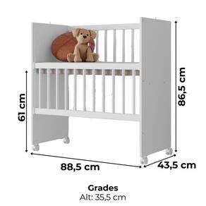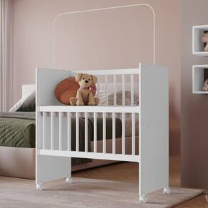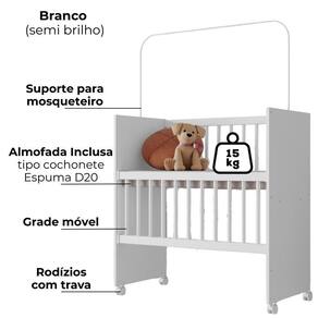 Mini Berço Encanto, desenvolvido para oferecer segurança e conforto ao bebê. Estrutura em MDP/MDF (6/12/15/25 mm) e acabamento UV. Composto por grade móvel e ajustavél (MDF revestivo em PVC virgem) e suporte superior para mosquiteiro. Possui rodízios com trava e acompanha almofada tipo colchonete (espuma D20). Não acompanha pelúcias ou itens de decoração. Produto será entregue em 01 volume.