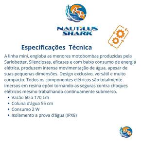 Vazão 60 a 170 L/h Coluna d’água 55 cm Consumo 2 W Isolamento a prova d’água (IPX8)