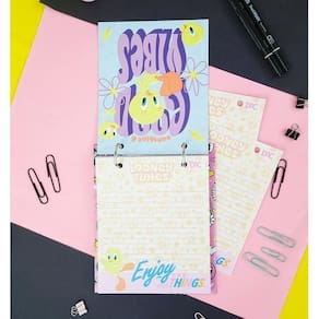 Observação: A foto é meramente ilustrativa e os itens adicionais como clips e canetas não acompanham o mini fichário.
