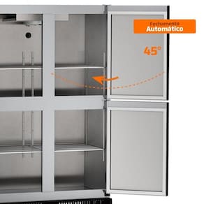 Suas 6 portas possuem puxadores em ângulo de 45 e fechamento automático, otimizando o manuseio. O isolamento térmico em poliuretano injetado preserva a refrigeração
