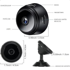 Especificações técnicas Modelo: A9 (mini câmera Wi-Fi)Conectividade: Wi-Fi 2.4 GHz (não compatível com 5 GHz)Visão Noturna: LEDs infravermelhos integradosDetecção de Movimento: com notificações pelo appGravação: suporte a cartão microSD (não incluso)Alimentação: USB 5V (cabo incluso) e bateria interna recarregávelInstalação: base magnética + acessório de fixaçãoCompatibilidade: Android e iOS (app indicado no manual)Idioma do app: multilíngue, incluindo português (varia conforme versão)