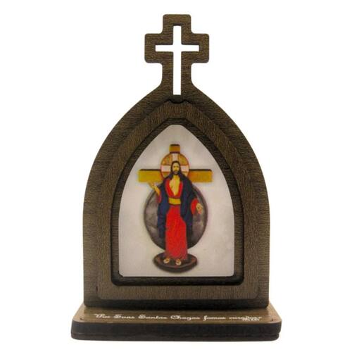 Mini capela com a imagem de Jesus das Santas Chagas e o versículo bíblico: 'Por Suas Santas Chagas fomos curados' (1Pd 2,24). Fabricada em MDF com acabamento em adesivo de alta qualidade, ideal para decoração de espaços religiosos, mesas de oração ou como presente de fé. Perfeita para levar inspiração e proteção para o seu dia a dia.
