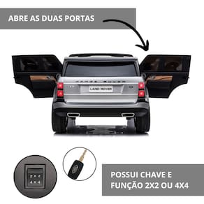 Deixe a criançada pegar a estrada com o Mini Carro Elétrico Range Rover! As brincadeiras ficarão muito mais realistas, pois o mini carro possui luzes, som e função frente e ré. O design incrível é licenciado pela Land Rover. O mini veículo pode ser controlado pela criança por meio de acionamento de pedal e controle da direção, assim como, por um adulto utilizando o controle remoto. É ideal para crianças de 3 a 7 anos, com capacidade de até 25kg. Possui marcha para frente, ré e neutro. Simplesmente o melhor do passeio com a maior aventura. Altamente resistente e durável, peças de qualidade, selo Inmetro e Anatel, para assim, garantir conforto, e principalmente, segurança para os pequenos pilotos.