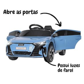 Deixe a criançada pegar a estrada com o Mini Carro Elétrico Audi E-tron! As brincadeiras ficarão muito mais realistas, pois o mini carro possui luzes, som e função frente e ré. O design incrível é licenciado pela Audi. O mini veículo pode ser controlado pela criança por meio de acionamento de pedal e controle da direção, assim como, por um adulto utilizando o controle remoto. É ideal para crianças de 3 a 8 anos, com capacidade de até 30kg. Possui marcha para frente, ré e neutro. Simplesmente o melhor do passeio com a maior aventura. Altamente resistente e durável, peças de qualidade, selo Inmetro e Anatel, para assim, garantir conforto, e principalmente, segurança para os pequenos pilotos.