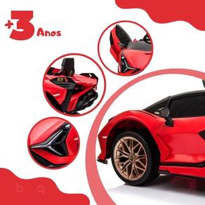 Modelado com base na luxuosa Larborghini Sian, esta versão licenciada de brinquedo infantil possui motores potentes, controle remoto, farol e som.