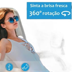 - Ventilador de Mesa Portátil; - Umidificador Integrado; - Funcionalidade Giratória de 360 graus; - Três Velocidades de Ventilação; - Dois Jatos de Resfriamento; - Capacidade do Reservatório de Água Aproximada: 100ml; - Bateria Recarregável; - Cabo USB adaptador de tomada não incluso ; - Bivolt; - Funcionamento Silencioso; - Botão Liga/Desliga; - Indicador de Carregamento LED Vermelho na Parte Traseira; - Duração da Bateria Aproximada: 5 horas; - Tempo de Carregamento Aproximado: 1 hora.
