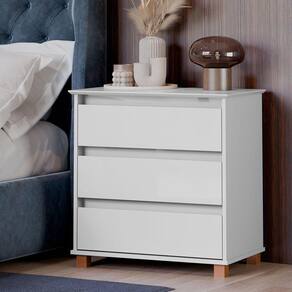 Características da Mini Cômoda para Quarto 3 Gavetas Prisma: - Produzida em MDP/MDF; - Acabamento de pintura UV; - 4 Pés em madeira maciça; - 3 Gavetas com corrediças telescópicas; - Suporta até 20kg bem distribuídos; - Não acompanha objetos decorativos; - Montagem por conta do comprador;