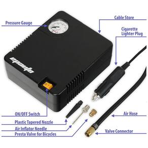 Conveniência conecte diretamente na tomada do isqueiro do seu veículo. Vários usos Encha pneus em carros, bicicletas, sedan e SUV de médio porte. NÃO SUPORTA pneus LT, HT e caminhão. Conjunto de adaptadores incluído Válvula Presta para bicicletas, Agulha de insuflação de ar e Bico Cônico de Plástico Compacto 15 x 12 x tamanho compacto para fácil zenamento. Insuflador de pneus 12V DC apenas para uso ocasional Marca: Não Informado