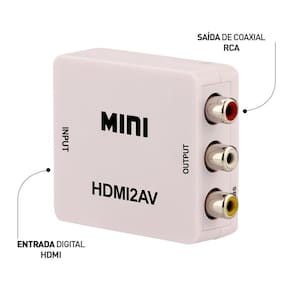 Mini Conversor Hdmi Para Vídeo Composto rca Ligue seu video game, notebook, dvd, sistema de câmeras, ou quaquer outro dispositivo que possua saída HDMI diretamente em televisores ou monitores que ainda utilizam a entrada AV Composite RCA com facilidade utilizando esse Mini Conversor HDMI para Vídeo Composto RCA . Tenha imagens nítidas e com qualidade de áudio. Imagens Full HD de 1080p. Basta ligar o cabo HDMI na porta de entrada do conversor, e, em seguida, ligue um cabo de Áudio e Vídeo Composto padrão RCA-amarelo, vermelho e branco do conversor para a TV. É necessário ligar o cabo USB já incluso para fornecimento de energia. Especificações: Cor: Branco Entrada: HDMI Saída: AV RCA, Composite, CVBS Resoluções: 1080p / 720p Peso: 60g Dimensões: 6 x 5 x 2cm Conteúdo da Embalagem: 1 Adaptador HDMI para Áudio e Vídeo RCA, Composite, CVBS 1 Cabo USB 1 Manual - Este produto não é compatível com DVR. Atenção: Verifique a compatibilidade com seu equipamento antes da compra, não nos responsabilizamos por incompatibilidades. Homologação Anatel: 136132205567