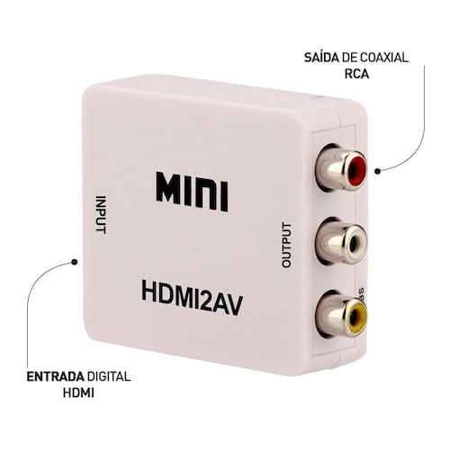 Mini Conversor Hdmi Para Vídeo Composto rca Ligue seu video game, notebook, dvd, sistema de câmeras, ou quaquer outro dispositivo que possua saída HDMI diretamente em televisores ou monitores que ainda utilizam a entrada AV Composite RCA com facilidade utilizando esse Mini Conversor HDMI para Vídeo Composto RCA . Tenha imagens nítidas e com qualidade de áudio. Imagens Full HD de 1080p. Basta ligar o cabo HDMI na porta de entrada do conversor, e, em seguida, ligue um cabo de Áudio e Vídeo Composto padrão RCA-amarelo, vermelho e branco do conversor para a TV. É necessário ligar o cabo USB já incluso para fornecimento de energia.