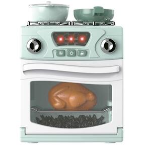 Aperte os botões para acender a luz e os sons O fogão é todo funcional. Vem com panelinhas e um frango para assar.