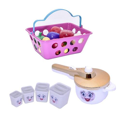 O kit vem com panelinha de pressão, potinhos de mantimentos, mercadinho com frutas e legumes