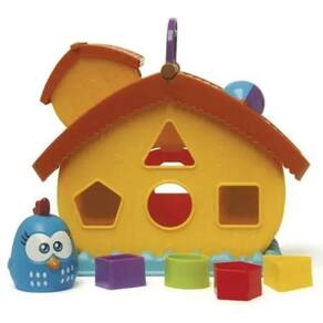 Gire a chave e abra a portinha. Janelinha com surpresa. Levante o teclado para guardar as peças. Bolinha gira-gira. Peças com forma geométricas para encaixar. Boneco para brincar.