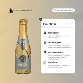 O Mini Gaseificado Sem Álcool Branco Doce Moscato Mayos 187 mL une sofisticação e bem-estar em uma porção prática e elegante. Produzido na Serra Gaúcha com uvas Moscato, Lorena e Niágara, apresenta coloração amarelo-palha brilhante, borbulhas finas, aroma floral e frutado e doçura natural sem adição de açúcar. Com 0,0% de álcool, é seguro para gestantes, motoristas e crianças, ideal para acompanha individuais, eventos e mocktails, oferecendo frescor, leveza e o requinte de um espumante tradicional, porém totalmente sem álcool e sem glúten. Marca: Não Informado Ean: 7897015212473