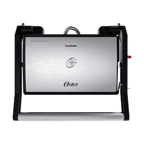 Mini Grill Oster 2 em 1 com chapas antiaderentes, abertura de 180º e potência de 1000W. Ideal para lanches, carnes, peixes e espetinhos.Termostato regulável