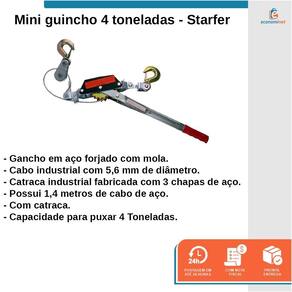 O Mini Guincho é ideal para mover equipamentos pesados, apertar cercas, remover árvores, troncos e obstáculos, ajudar no carregamento de barcos e trailers, e livrar veículos encalhados. Produzido com 3 chapas de aço que garante melhor resistência e durabilidade.CARACTERÍSTICAS TÉCNICAS:Material: Aço Galvanizado e Cabo EmborrachadoMaterial dos Ganchos: Aço ForjadoMedidas: 5,6mm (diâmetro cabo) x 1,4m (comprimento)Capacidade para puxar: 4000KgCapacidade para suspender: 1000KgMarca: StarferRef.: 9285016