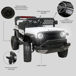 Equipado com motor 12V, o jipe oferece ótimo desempenho para passeios em diferentes tipos de terrenos, graças às suas rodas largas e resistentes, garantindo estabilidade e conforto durante o uso.
