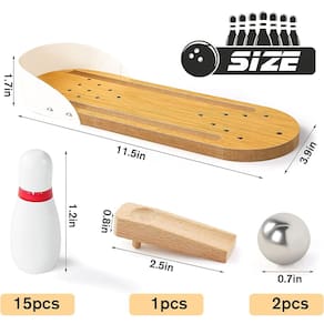 - Pacote de conjunto de boliche - Inclui: 1 x base de madeira, 10 x bolas de boliche, 1 x rampa, 1 x bola de aço inoxidável, tamanho do produto: 29,5 x 9,9 cm