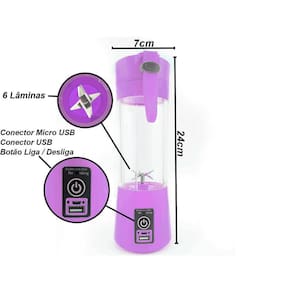 Mini Liquidificador Portátil Misturador Shake Squeeze Juice Cup Recarregável Usb 6 Lâminas Smooth Recarregável Cor: Roxo Características: Mini Liquidificador Portátil Recarregável Juice Cup Uma nova maneira de preparar Sucos, Vitaminas, Shakes e muito mais.A qualquer hora e em qualquer lugar, verdadeiramente portátil. Conta com alça de silicone para melhor transportá-lo. Você mistura e bebe na mesma garrafa. O presente ideal para amigos e para você mesmo, por ser portátil e com design revolucionário permite ser levado para academia, viagens e até mesmo em escritório. Instrução de uso: Lave as frutas, corte em pedaços pequenos coloque na garrafa, cerca de 60% do copo após adição do líquido, de modo que o volume total represente cerca de 80% do copo. Agite o produto para um melhor funcionamento, e pressione o interruptor 2 vezes seguidas para iniciar o motor, em seguida delicadamente agitar o produto. Pronto Seu maravilhoso Shake, Suco está pronto para saborear. Especificações: - Carregamento via USB do computador ou carregador de celular - Capacidade: 380ml - Motor: DC 3.7v - Rotação do motor: Carga Completa: 22000 RPM - Corrente de trabalho: 10-12A - Dimensões: 24 x 7cm (Alt x Diâmetro) Peso e Medida: - Peso: 0,444 g- Altura: 24 cm- Diâmetro: 7 cm Itens Inclusos: - 01 Liquidificador 6 Laminas - 01 Cabo USB - 01 Manual Marca: Negocio de genio