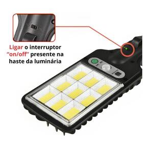 Não acompanha controle Luminária solar parede sensor presença com 3 funções Esta é uma luminária solar com detector de movimento e acendimento automático, que funciona com energia solar e é à prova dágua. Ela é ideal para iluminar áreas externas, como caminhos, jardins, corredores, etc. Ela tem três modos de funcionamento, que podem ser selecionados pelo botão. Veja a seguir as características e o conteúdo do pacote deste produto. Características Material: abs+pc Fonte de energia: solar Painel solar: 3.2v 4w Número de pérolas da lâmpada: 108 cobs Distância de detecção: 3-5 m Autonomia de iluminação: 4h em luz constante e 12h utilizando sensor de movimento em locais pouco movimentados Tempo de vida do led: 50000 h Cor dos leds: branco Tipo de instalação: fixado na parede : botão Sensor de movimento ângulo: 120º on/off Modos de funcionamento Função 1: permanece desligada quando não detecta movimento, acende sua luz máxima sempre que detectar movimento. pressione botão de ligar 1 vez Função 2: ligada em luz fraca e acende luz máxima ao detectar movimento. pressione botão de ligar duas vezes Função 3: ligada de forma constante em luz média mesmo sem detectar movimento. pressione botão de ligar tres vezes Conteúdo do pacote 1xluminária solar com painel solar 3xparafusos 3xbuchas 1xmanual Marca: Não Informado Ean: 79070437081392