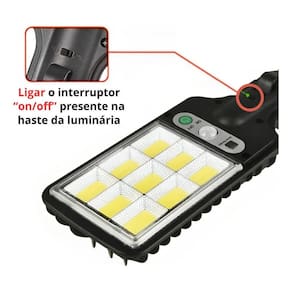 Mini Luminária Solar Goldensky Poste Rua Parede Refletor 108 Cob Sensor Luz Branca Fria Cor Preto Não acompanha controle Luminária solar parede sensor presença com 3 funções Esta é uma luminária solar com detector de movimento e acendimento automático, que funciona com energia solar e é à prova dágua. Ela é ideal para iluminar áreas externas, como caminhos, jardins, corredores, etc. Ela tem três modos de funcionamento, que podem ser selecionados pelo botão. Veja a seguir as características e o conteúdo do pacote deste produto. Características Material: abs+pc Fonte de energia: solar Painel solar: 3.2v 4w Número de pérolas da lâmpada: 108 cobs Distância de detecção: 3-5 m Autonomia de iluminação: 4h em luz constante e 12h utilizando sensor de movimento em locais pouco movimentados Tempo de vida do led: 50000 h Cor dos leds: branco Tipo de instalação: fixado na parede : botão Sensor de movimento ângulo: 120º on/off Modos de funcionamento Função 1: permanece desligada quando não detecta movimento, acende sua luz máxima sempre que detectar movimento. pressione botão de ligar 1 vez Função 2: ligada em luz fraca e acende luz máxima ao detectar movimento. pressione botão de ligar duas vezes Função 3: ligada de forma constante em luz média mesmo sem detectar movimento. pressione botão de ligar tres vezes Conteúdo do pacote 1xluminária solar com painel solar 3xparafusos 3xbuchas 1xmanual Marca: Não Informado Ean: 79061922727499