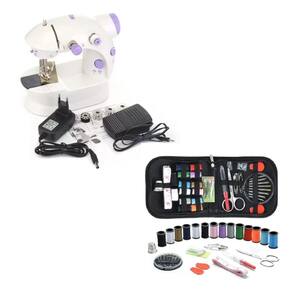 Mini máquina de costura portátil com kit de 27 itens para reparos rápidos. Inclui 14 cores de linhas, disco com 14 agulhas, tesoura, fita métrica, dedal, passadores de linha, botões e desmanchador de costura. Estojo prático com zíper.Funções