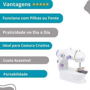 Mini costureira, compacta e funcional, ideal para reparos e ajustes de roupas Descrição do anúncio: A mini máquina de costura reta portátil bivolt compacta é a ferramenta perfeita para todas as suas necessidades de costura, sejam elas básicas ou criativas. Ideal tanto para iniciantes quanto para profissionais experientes, essa máquina oferece praticidade e versatilidade com seu design leve e portátil, podendo ser utilizada tanto conectada à tomada quanto com pilhas. Com diversos recursos úteis, como seleção ajustável de pontos e lâmina para cortar linha, essa máquina é durável, confiável e fácil de armazenar em pequenos espaços. Conteúdo da embalagem: 01 mini máquina de costura 01 fonte de energia com tomada 01 pedal de acionamento 04 mini carretéis de linha Características: Ponto fixo de duas linhas Seletor de alta/baixa velocidade Costura dianteira e reversa Rebobinamento automático da linha Comprimento ajustável do ponto manual ou pedal para iniciar Luz projetada no local da costura Ajuste de posições Lâmina para cortar a linha Construída com materiais de alta qualidade para desempenho estável e preciso Especificações: Modelo: mini máquina de costura Material: plástico resistente, metal, componentes elétricos Alimentação de energia: tomada plugue padrão inclusa ou 04 pilhas aa não inclusas Voltagem: 110v/220v Dimensões aproximadas: 19cm altura x 19cm comprimento x 9,5cm largura Peso aproximado: 610g Principais perguntas sobre o produto e respostas: A máquina de costura é bivolt Sim, a mini máquina de costura é bivolt automático. Posso usar a máquina sem estar conectada à tomada Sim, a máquina pode ser utilizada com 4 pilhas aa não inclusas , proporcionando portabilidade. Quais acessórios estão incluídos na embalagem A embalagem inclui 01 mini máquina de costura, 01 fonte de energia com tomada, 01 pedal de acionamento, e 04 mini carretéis de linha. A máquina é adequada para iniciantes Sim, a máquina é ideal tanto para iniciantes quanto para profissionais, oferecendo diversas funcionalidades e facilidade de uso. Qual é a do produto O vendedor oferece uma de 30 dias para a mini máquina de costura. Qual é a velocidade de costura da máquina A máquina faz 110 pontos por minuto. A máquina possui função de costura reversa Sim, a máquina possui função de costura dianteira e reversa. Quais são as dimensões do produto As dimensões aproximadas da máquina são 19cm altura x 19cm comprimento x 9,5cm largura . Qual é o peso do produto O peso aproximado da máquina é de 610g. Posso ajustar o comprimento do ponto de costura Sim, a máquina permite o ajuste do comprimento do ponto de costura. Marca: Não Informado