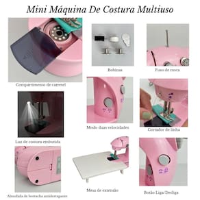 Mini máquina de costura portátil, 2 velocidades, pedal de acionamento, luz de LED, bivolt automático. Ideal para pequenos ajustes e trabalhos do dia a dia em tecidos finos. Possui mesa de apoio extensora.Funções