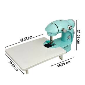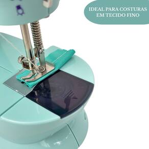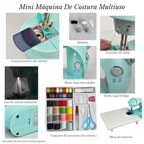 Máquina de costura doméstica portátil com mesa extensora e pedal de acionamento. Ideal para pequenos ajustes e trabalhos em tecidos finos. Possui iluminação e alimentaçao bivolt automático ou a pilhas.Funções