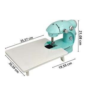 Máquina de costura doméstica portátil com mesa de apoio e pedal de acionamento. Ideal para pequenos trabalhos e ajustes em tecidos finos. Possui 1 ponto, passa linha manual, iluminação e bivolt automático.Funções