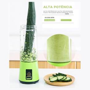 com bateria recarregável que possui autonomia para até 10 misturas. Tem sistema de proteção que não liga sem que o copo esteja encaixado na base. Além disso possui 6 lâminas que garantem mais potência para misturar basicamente qualquer tipo de fruta que precisar. Também conta com alça de silicone para melhor transportá-lo, seja no trabalho, academia ou faculdade, você terá sempre como preparar bebidas a qualquer momento. Instrução de uso: lave as frutas, corte em pedaços pequenos coloque na garrafa, cerca de 60% do copo após adição do liquido, de modo que o volume total representante cerca de 80% do copo. Não é para ser utilizado com congelados