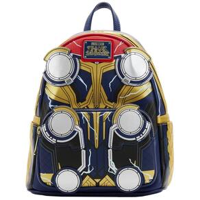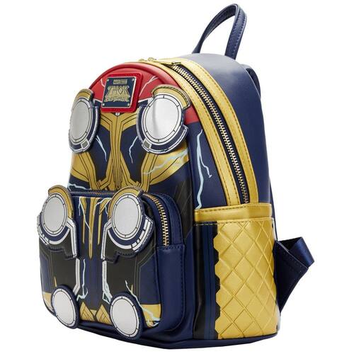Mini mochila Loungefly Marvel Thor L&T Cosplay — As características da mochila incluem acessórios dourados brilhantes, alças ajustáveis, bolsos laterais, couro vegano (poliuretano) e detalhes estampados que brilham no escuro, gravados, apliques, papel alumínio dourado e estampados. - Observe o revestimento coordenado. - Esta mochila é um produto oficialmente licenciado pela Marvel.